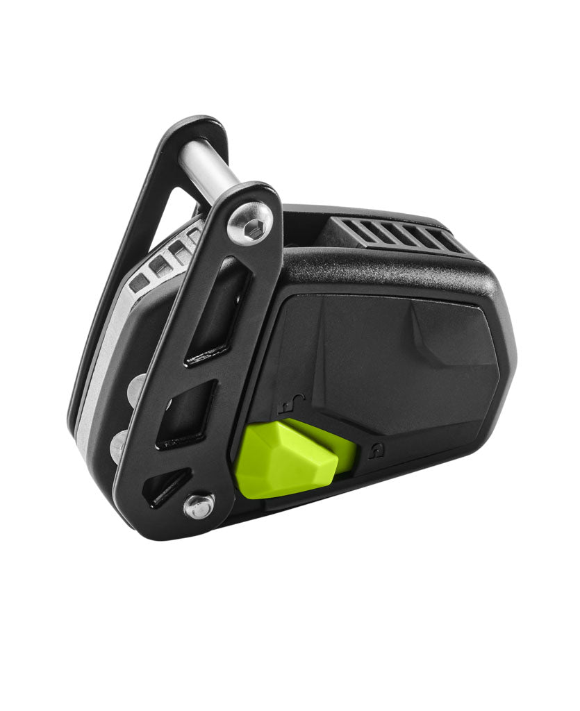 - Slät klämkam (utan tandning) minskar slitage på rep, förhindrar rivning och möjliggör frigöring utan full avlastning