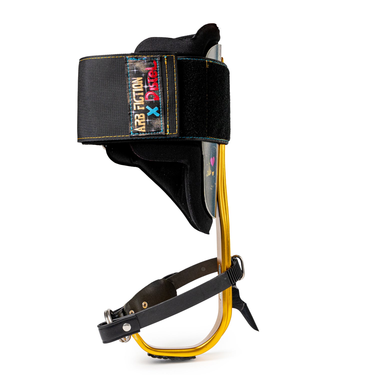 Distel x Arbfiction Alu Plus klättersporrar: En unik kombination av design och funktion. Begränsad upplaga med guld och turkos design, smidda av DMM för optimal prestanda och komfort.