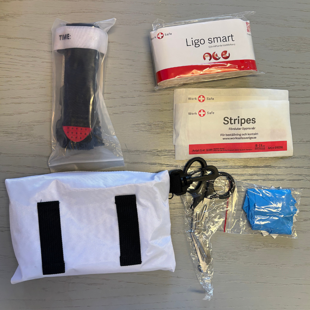 I kitet finns en pålitlig tourniquet för snabb blödningskontroll, ett elastiskt tryckförband för allvarliga sår och steri-strips för mindre skärsår. Nitrilhandskarna skyddar både dig och den skadade, medan traumasaxen klipper effektivt igenom rep, webbing och kläder. Alkoholtorkarna gör det möjligt att desinficera sår på plats – oavsett hur långt från närmaste sjukhus du befinner dig.