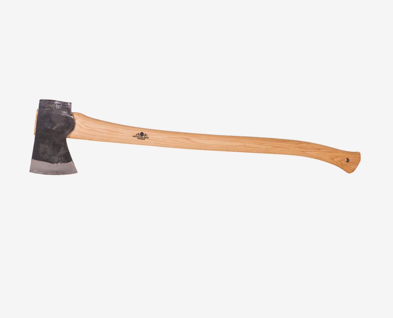 Skaftet är tillverkat av **amerikansk hickory** (härdat ask), det starkaste och mest flexibla träslaget för yxor. Det är impregnerat med varm linolja och behandlat med bivax för att stå emot väder och slitage samt ge ett naturligt grepp. **Eggskyddet** är av vegetabiliskt garvat läder från Tärnsjö Garveri – biologiskt nedbrytbart och fritt från tungmetaller. Yxan levereras **färdigslipad och vass** från Gränsfors Bruk, med Gränsfors stämpel som garant för hantverkskvalitet.