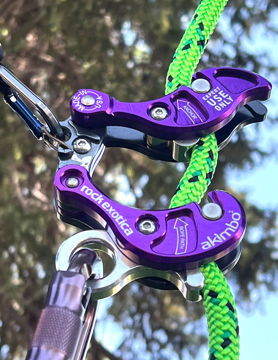 Rock Exotica Akimbo 2.0 är ett mångsidigt klätterverktyg för arborister. Den justerbara designen möjliggör säker och effektiv klättring och firning i både stationära och löpande repsystem.