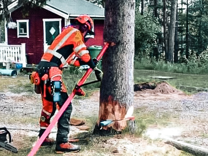 The Swedish-made tree felling device RH-pusher is an indispensable tool for safe felling of trees along roads, power lines, next to houses and for targeted felling of large trees.