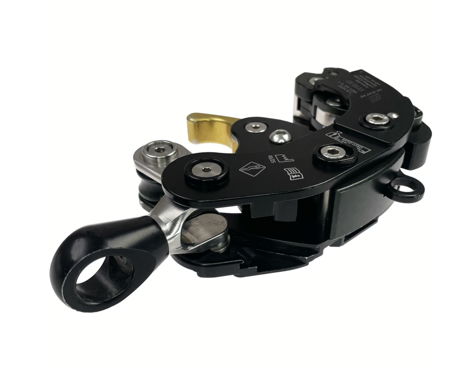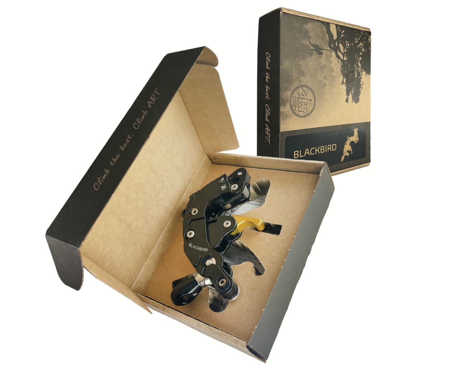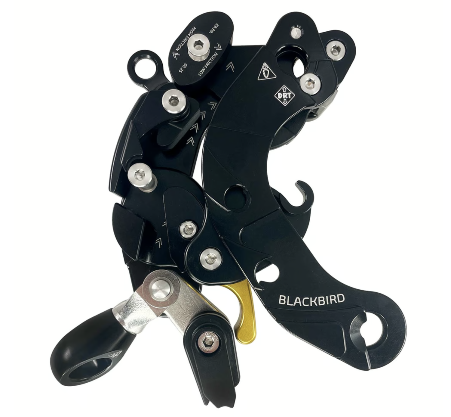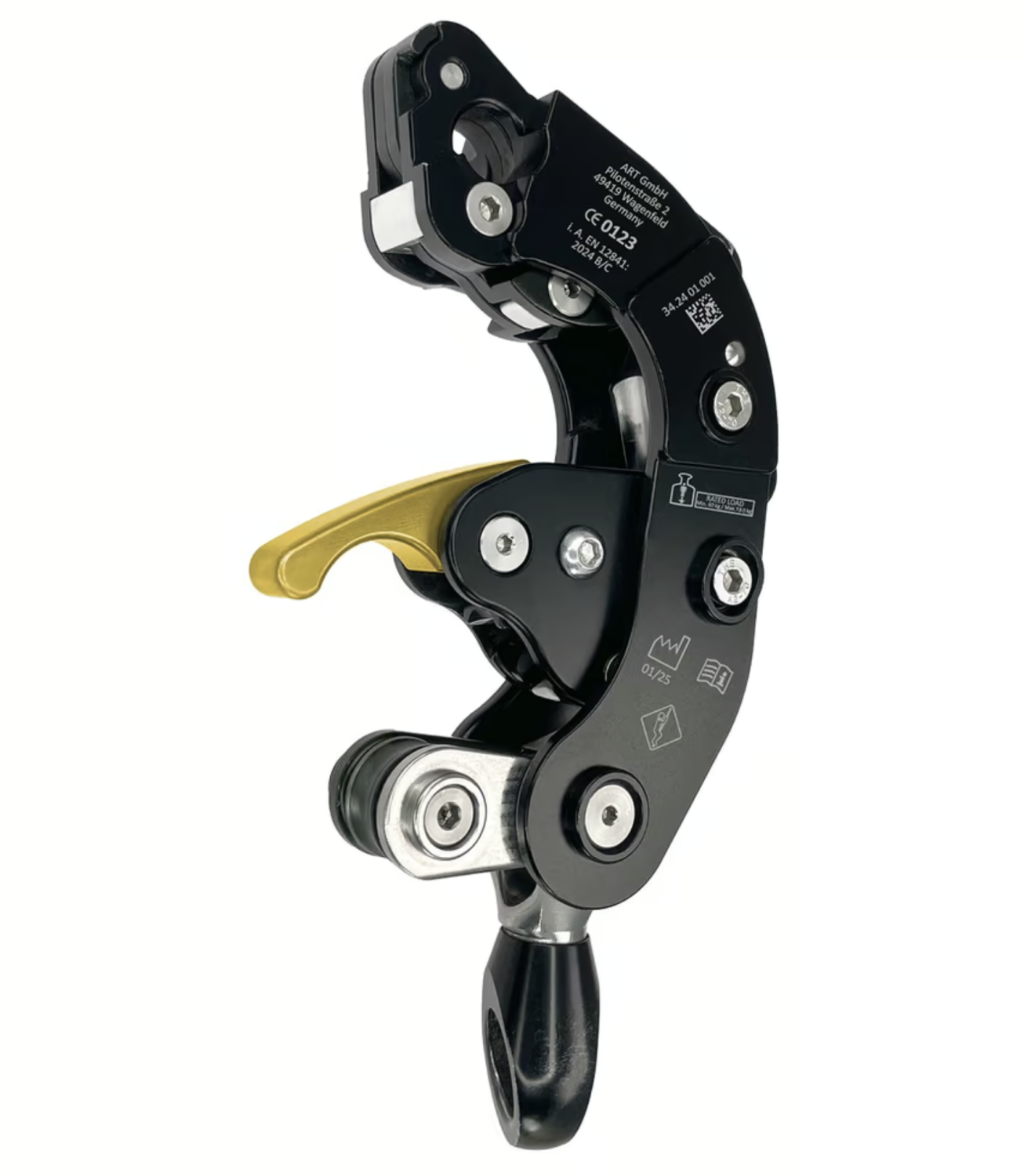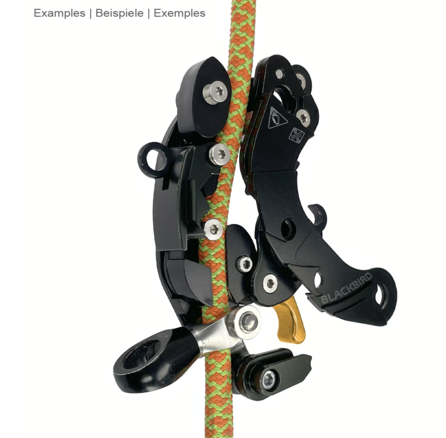 The BlackBird by ART has been designed to facilitate climbing both with a single rope system (SRS/SRT) and a moving rope system (MRS/DRT). Without additional adjustments or tools, it is possible to switch between both techniques. The rope does not need to be removed from the device for this. The construction allows for identical descent behaviour in SRT and MRS. The BlackBird can be fully opened with a push button and can be is mid-line attachable without the device needing to be detached from the harness.