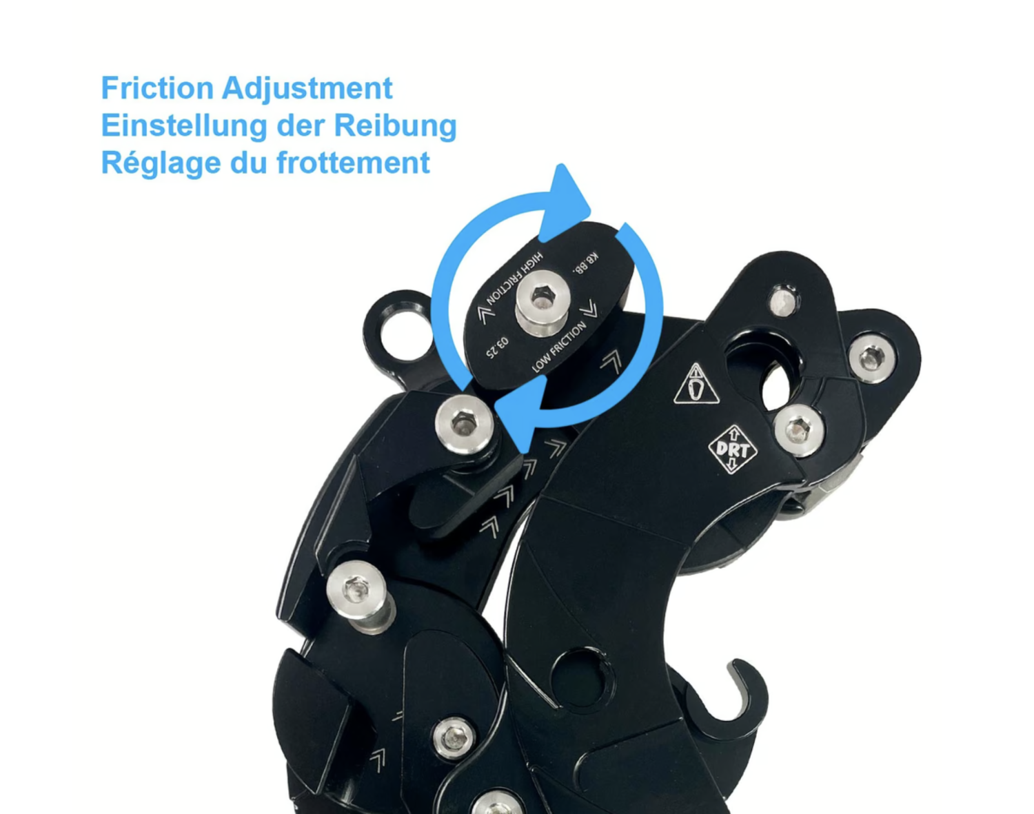 The integrated swivel ensures optimal alignment at all times. The upper carabiner attachment is positioned opposite the user, allowing the rope to be easily fed into the device. The upper attachment point can also be used for V-rigs as well as 3:1 or 4:1 pulley systems. A ball-bearing pulley allows for comfortable operation, even without a lot of slack. For individual adjustments, the cam can be rotated on the friction amplifier. A carabiner attachment enables connection to the chest harness to pull up the device during ascent. The BlackBird is approved for rescue with two persons on a single rope (SRT) and on a double rope (DRT).